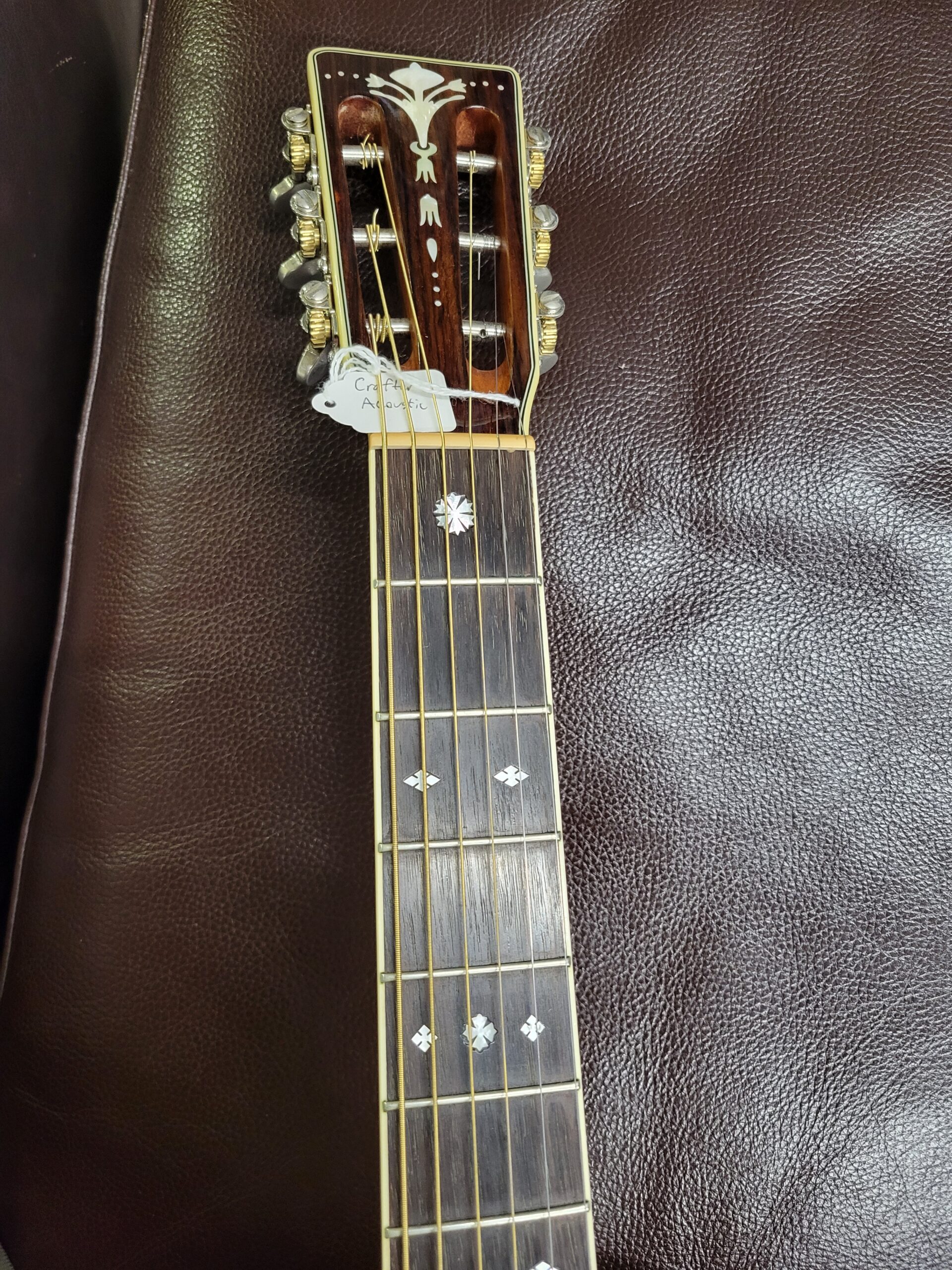 It has a fairly unique slot-head style headstock more commonly found on classical and Spanish style guitars, but that works just as well with steel strings.
