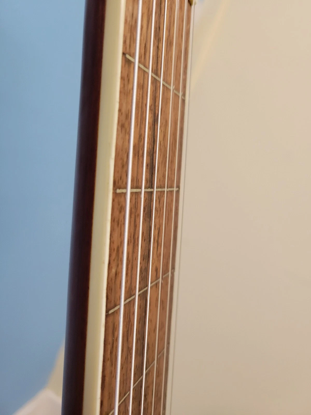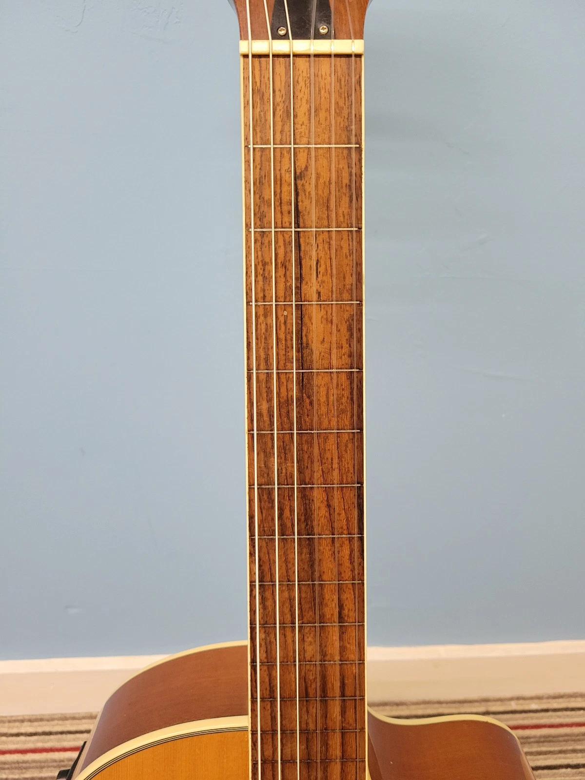 A bit of a rarity, this guitar is purely fretless, though it still has fret line inlays to aid in finger positioning.