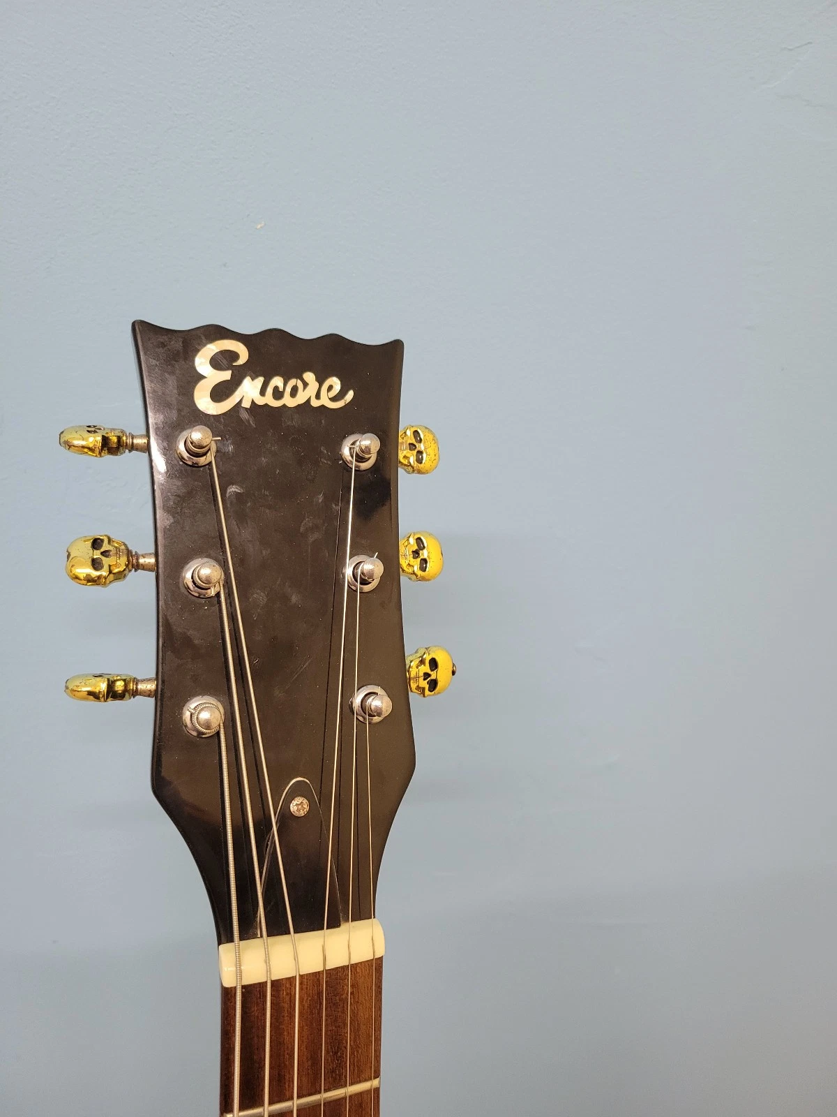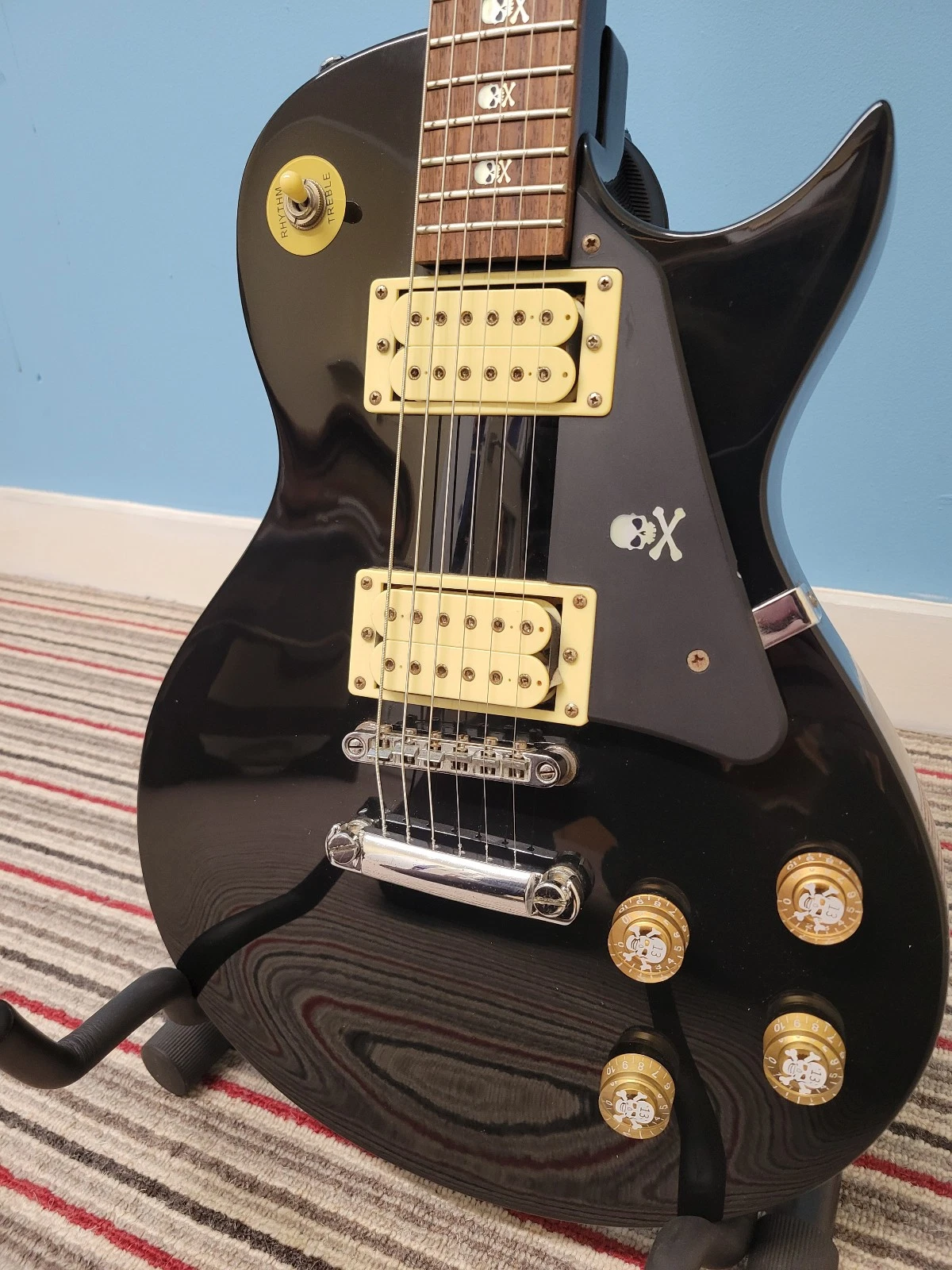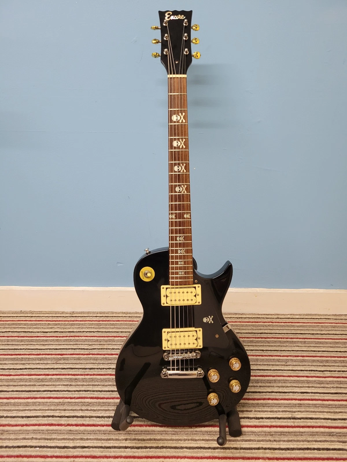This once was a basic encore LP style guitar, but the previous owner has modified it with skull decals over the fret markers on the neck, matching decals on the scratch plate, matching controls knobs, and skull themed machine heads.