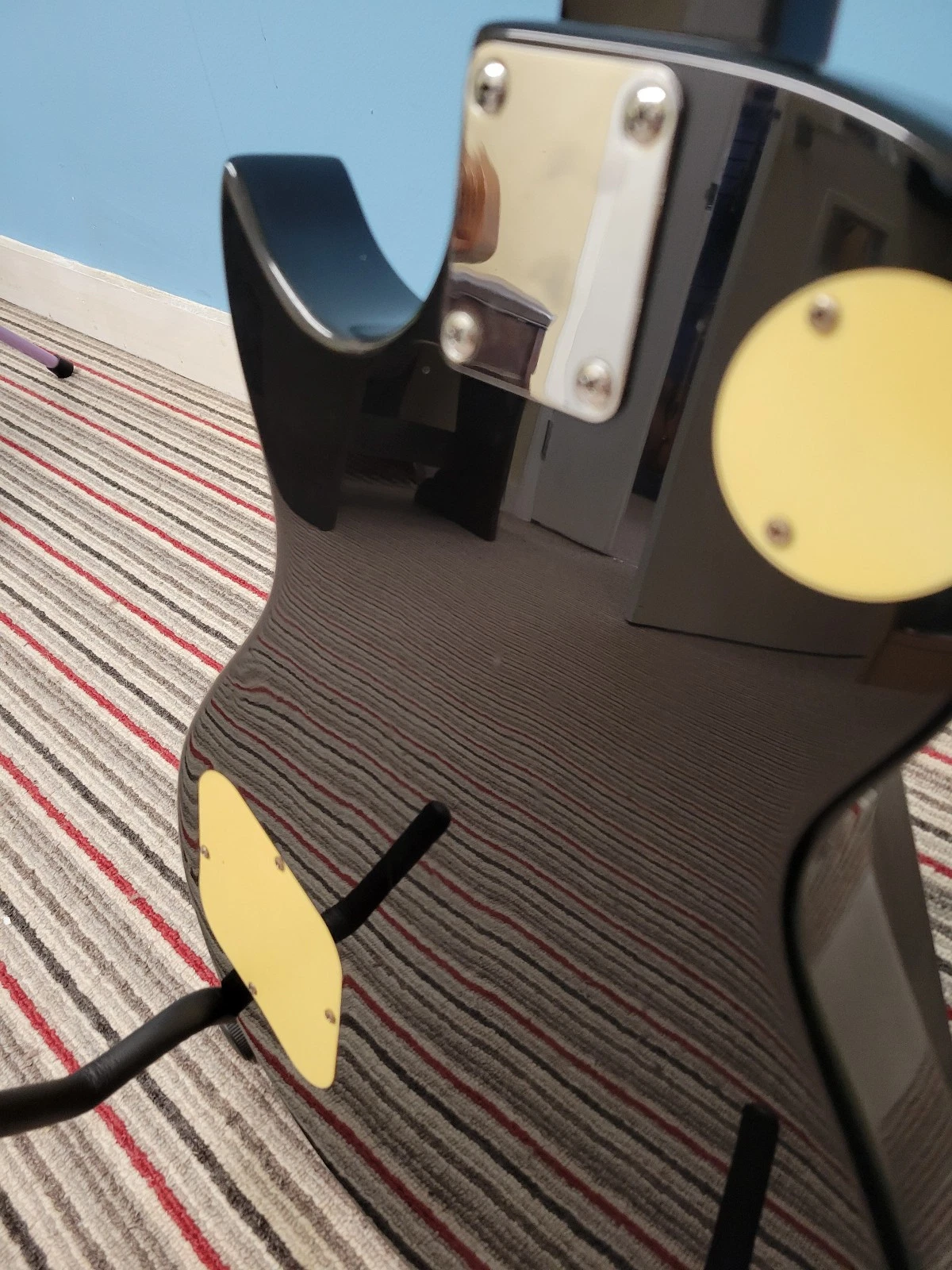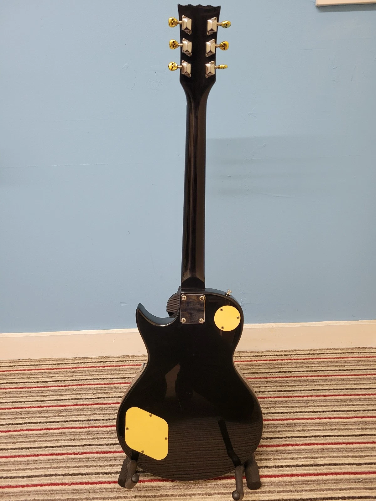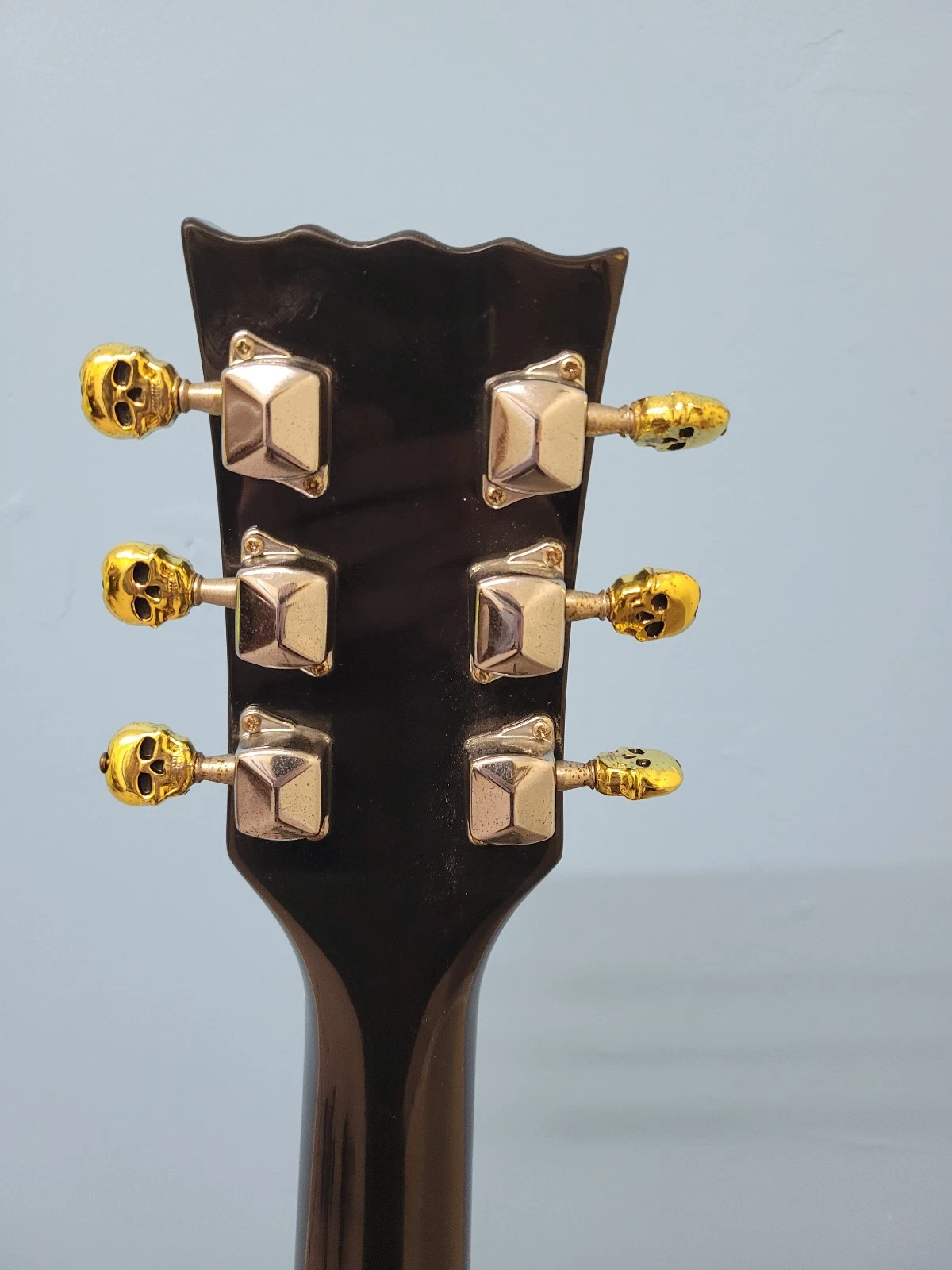 This once was a basic encore LP style guitar, but the previous owner has modified it with skull decals over the fret markers on the neck, matching decals on the scratch plate, matching controls knobs, and skull themed machine heads.