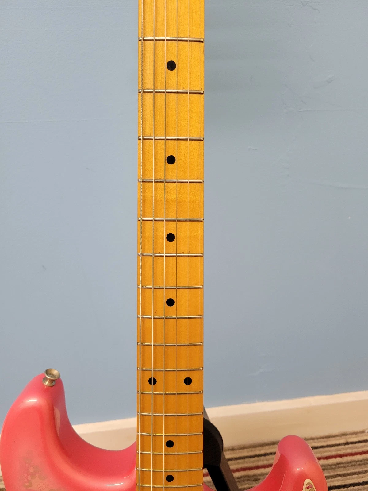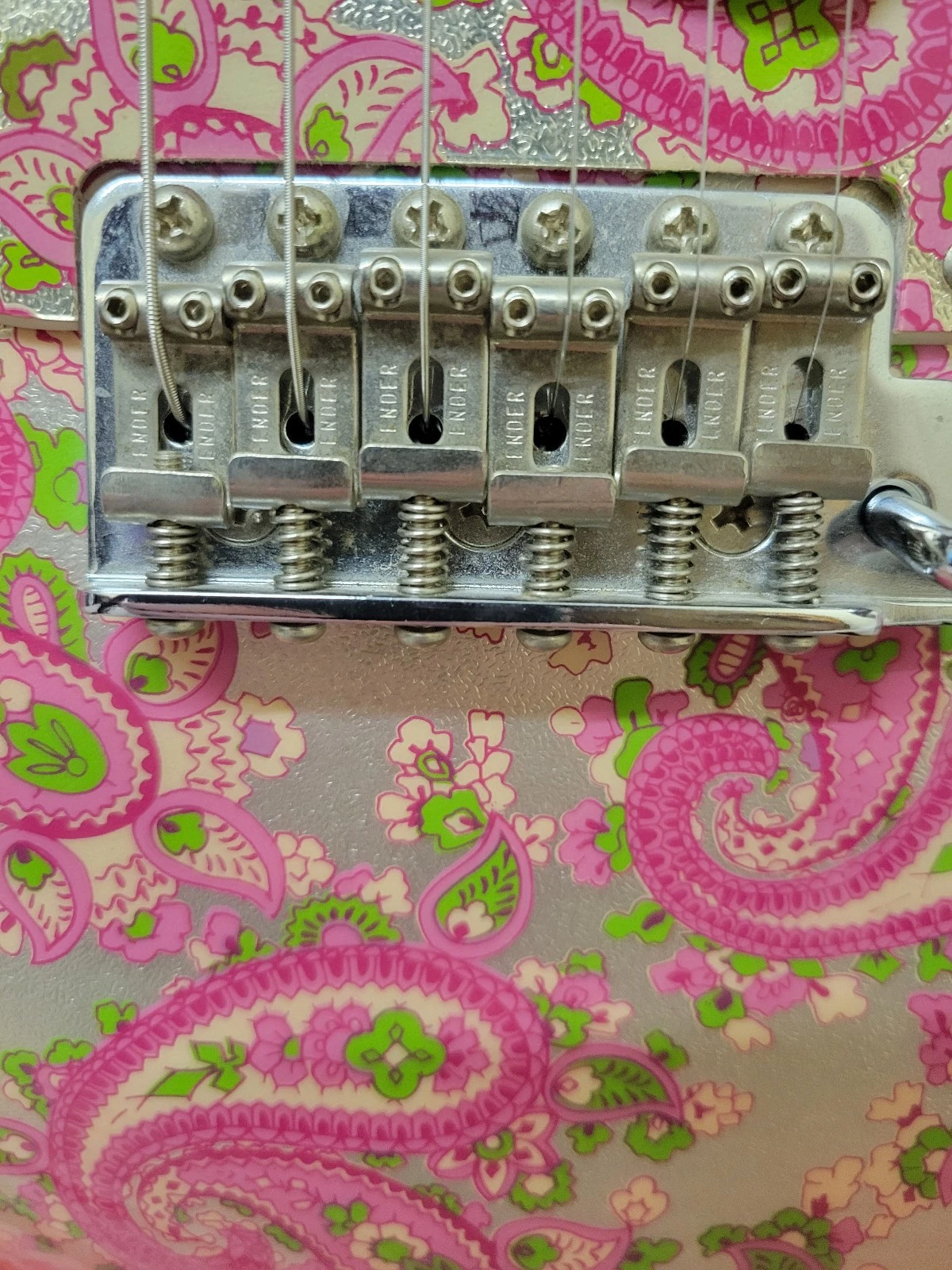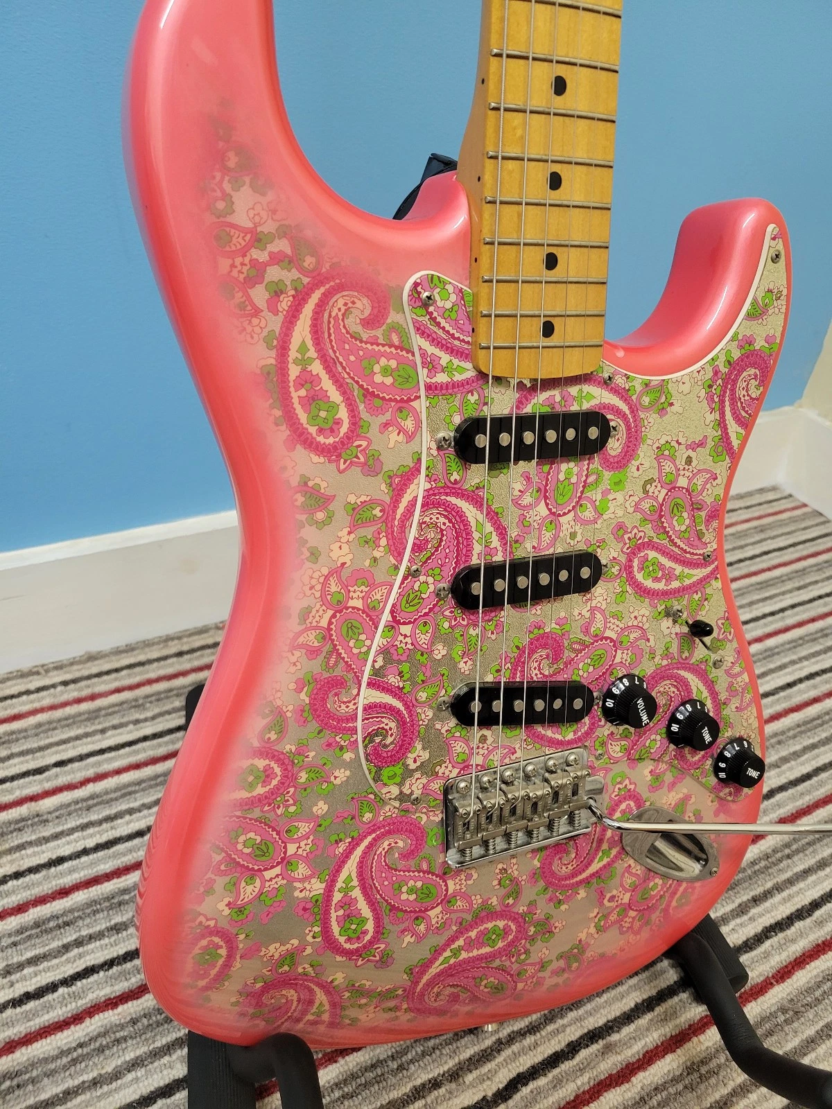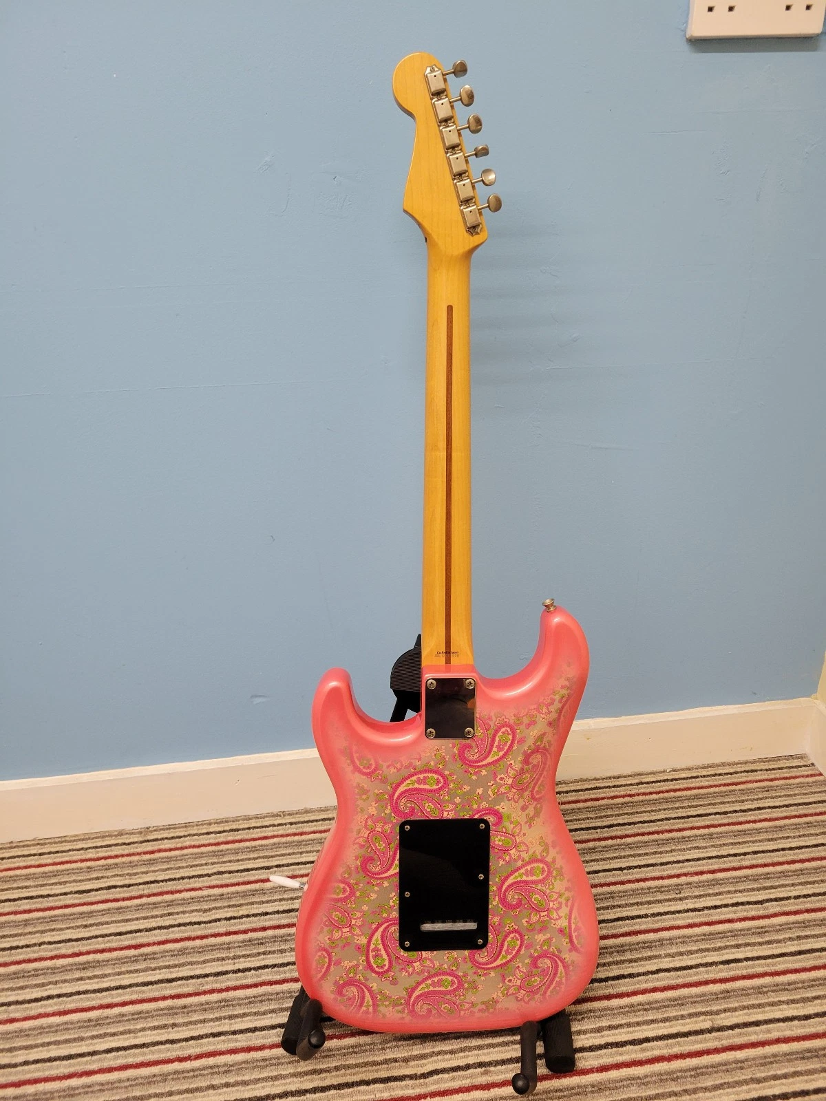 This genuine Fender Paisley Stratocaster was made in Japan between 2002 and 2004. It has a lovely maple neck and fingerboard with a Nitrocellulose finish for a vintage look and feel. The pink paisley body and design is a bit of a rarity and looks stunning.