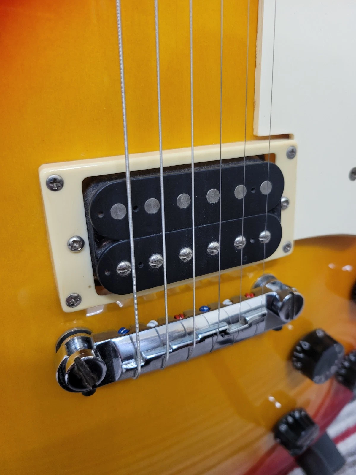 Tune-o-matic style fixed bridge with a wrap-around style tailpiece.