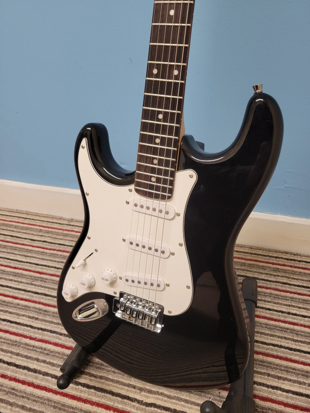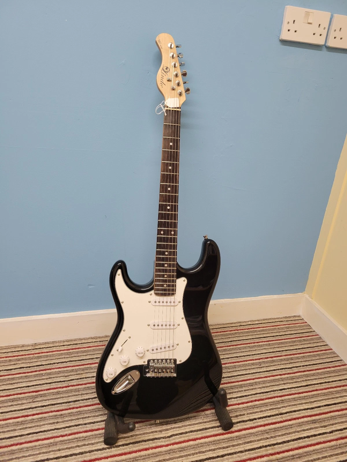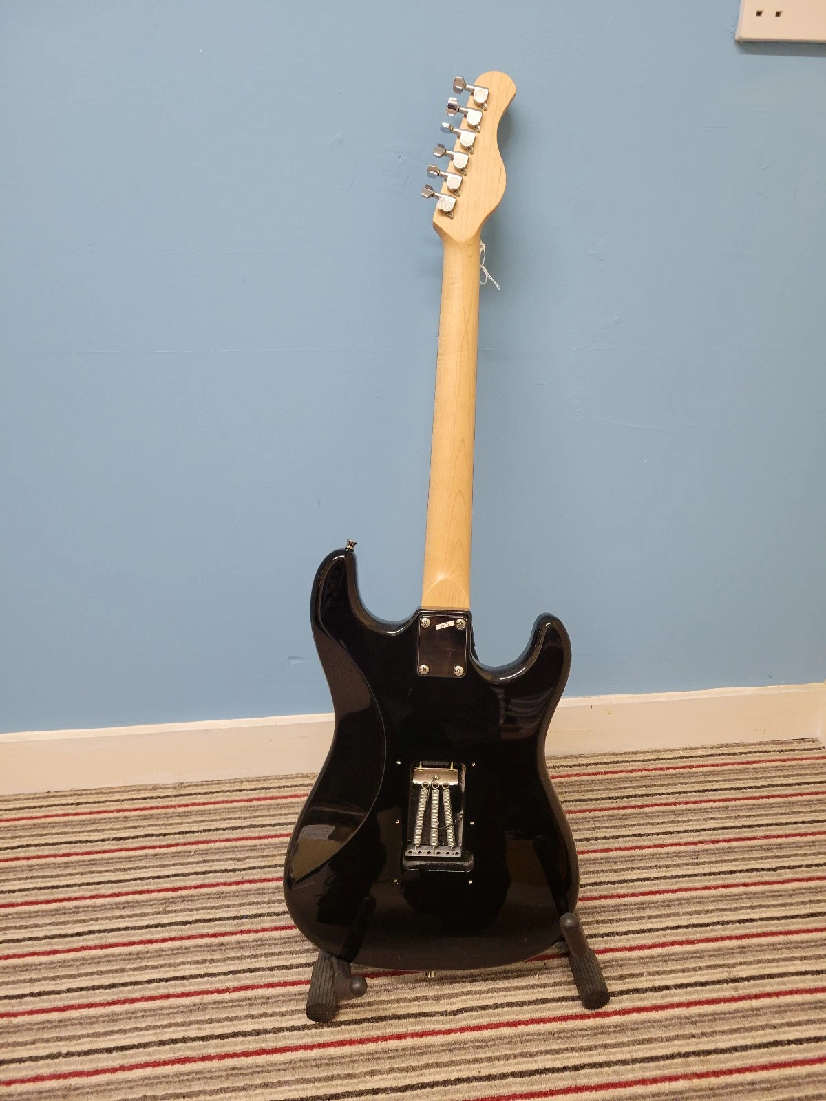 This electric guitar is based off the ubiquitous Stratocaster with a lovely double cutaway body and three single coil pickups.