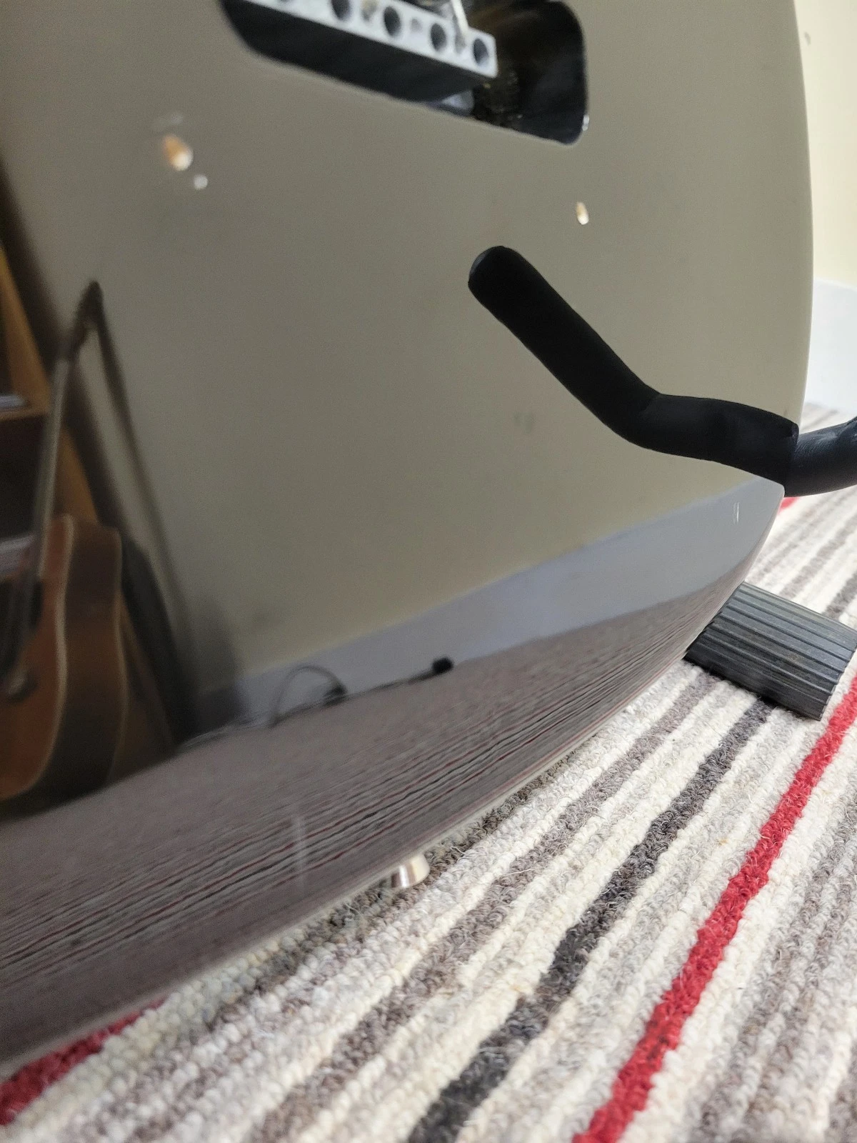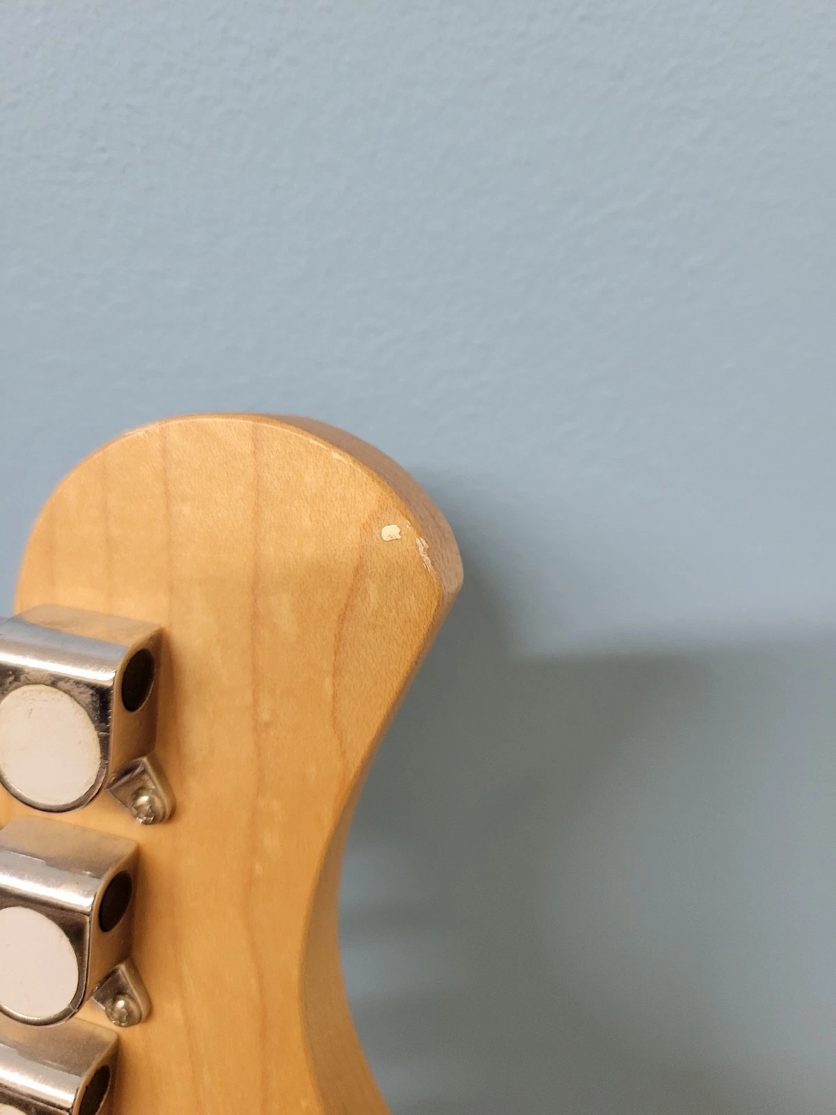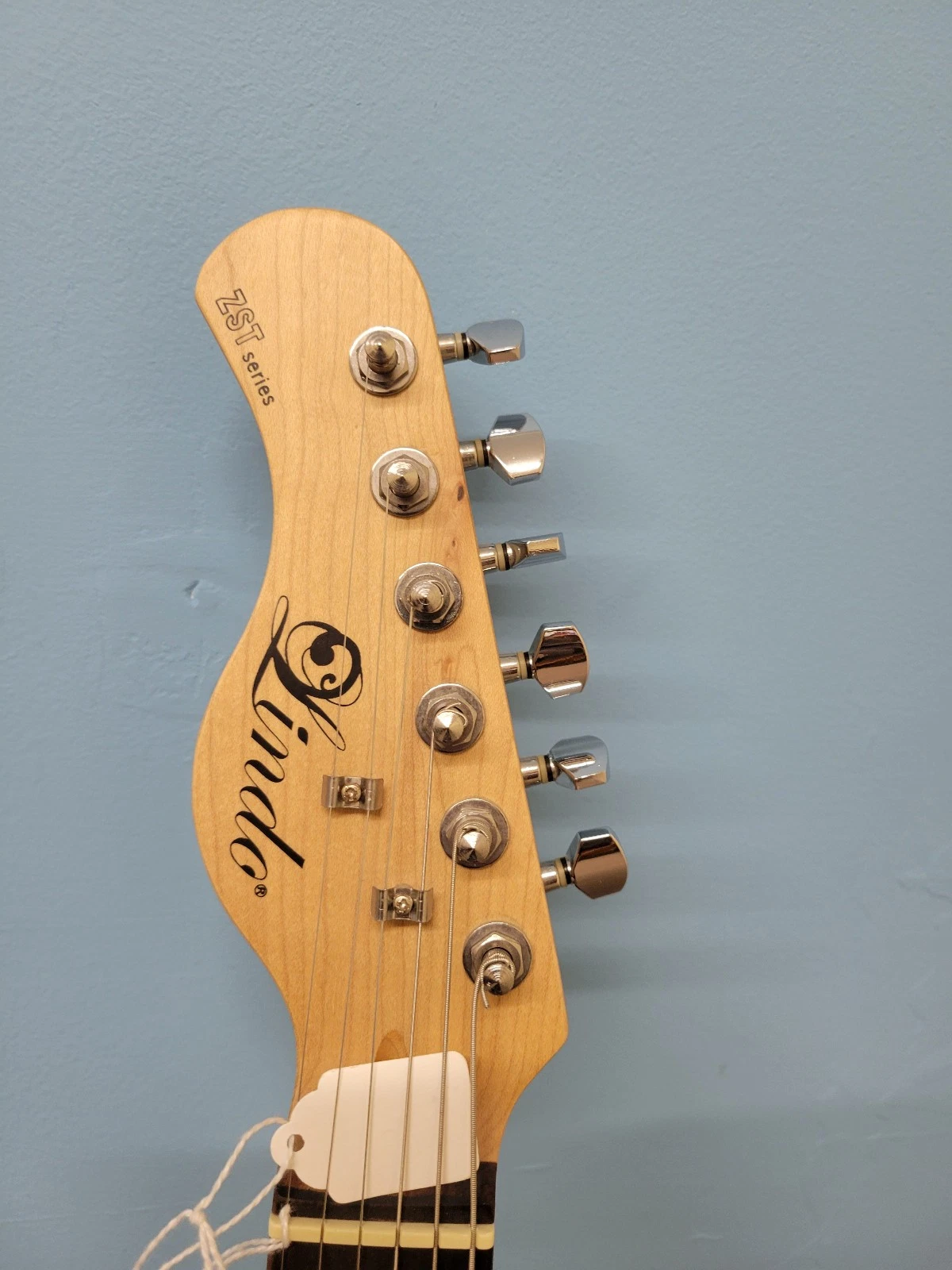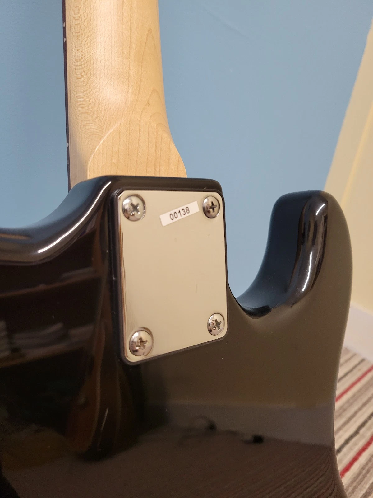 This electric guitar is based off the ubiquitous Stratocaster with a lovely double cutaway body and three single coil pickups.