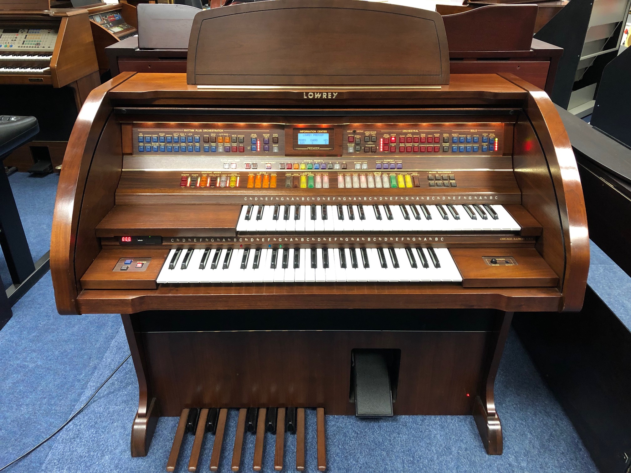 The Premier is a very popular mid range Lowrey containing great sounds, styles and features. It packs a big sound from a relatively compact cabinet which includes a roll top lid. This model is in the rich walnut cabinet. Comes with a USB memory stick pre-loaded with additional presets.