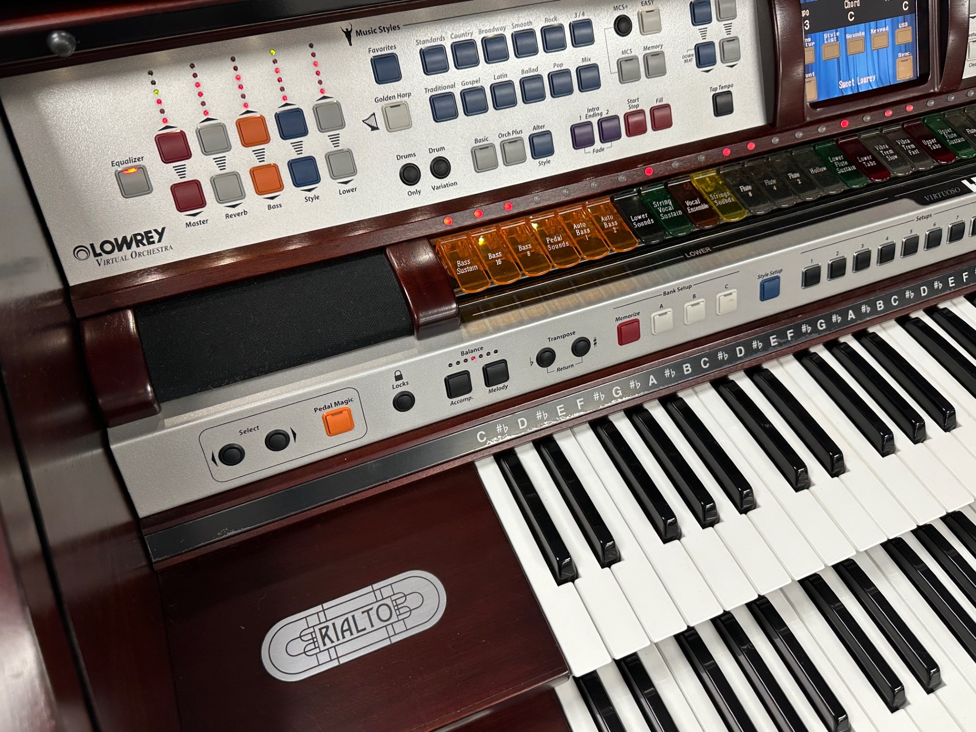 The Lowrey organ tone sounds sweeter than ever. Love Theatre or Pipe Organ? These are just a button press away The style of the Rialto offer a virtual orchestra ready to accompany you.
